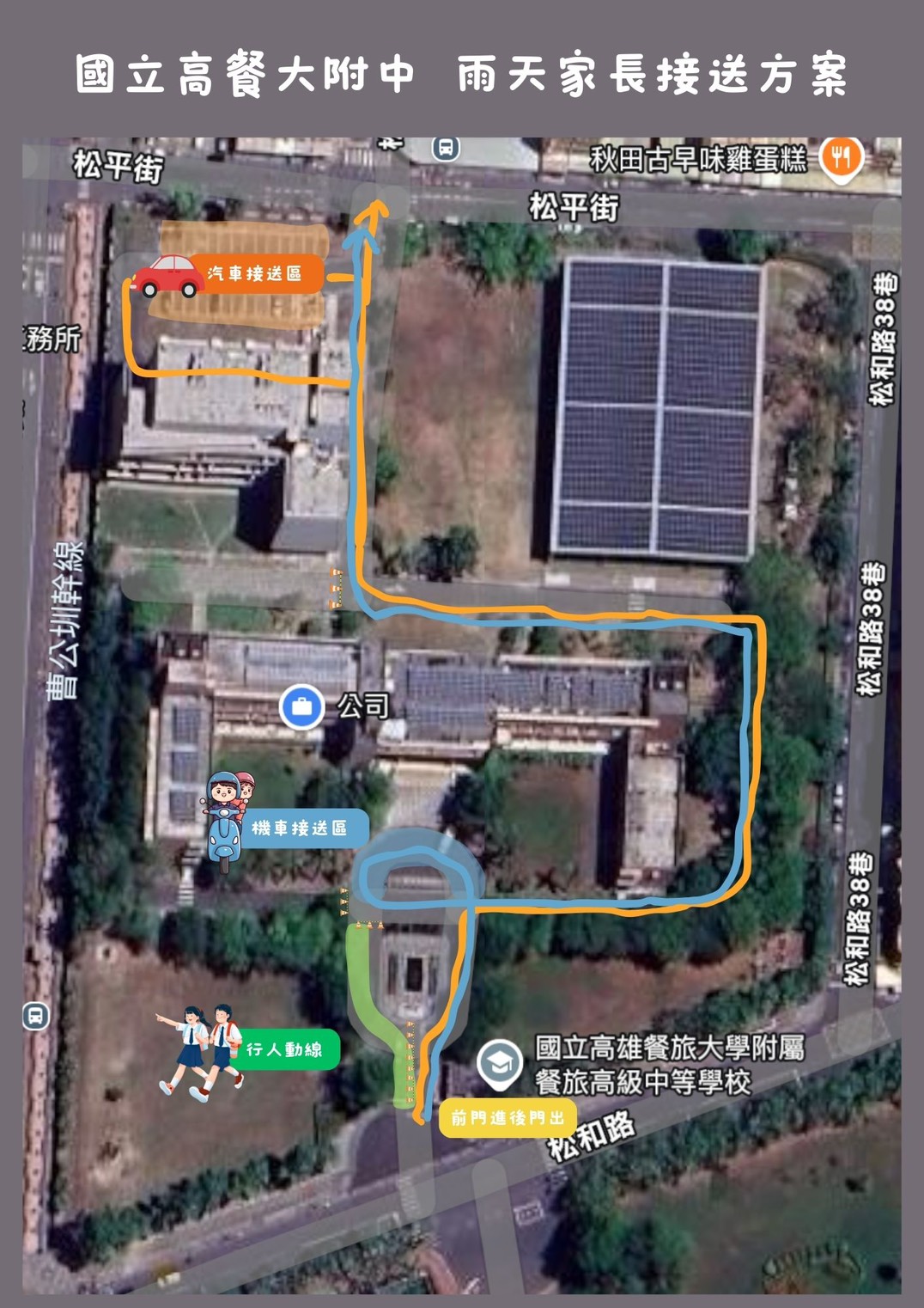 如遇豪大雨,本校開放進校園接同學。機車可由右方繞至中庭接同學,再由中間往右後方繞出後門。汽車則是於實習大樓後方停車場接同學後,再從後門出校園。詳細路線如附件圖。