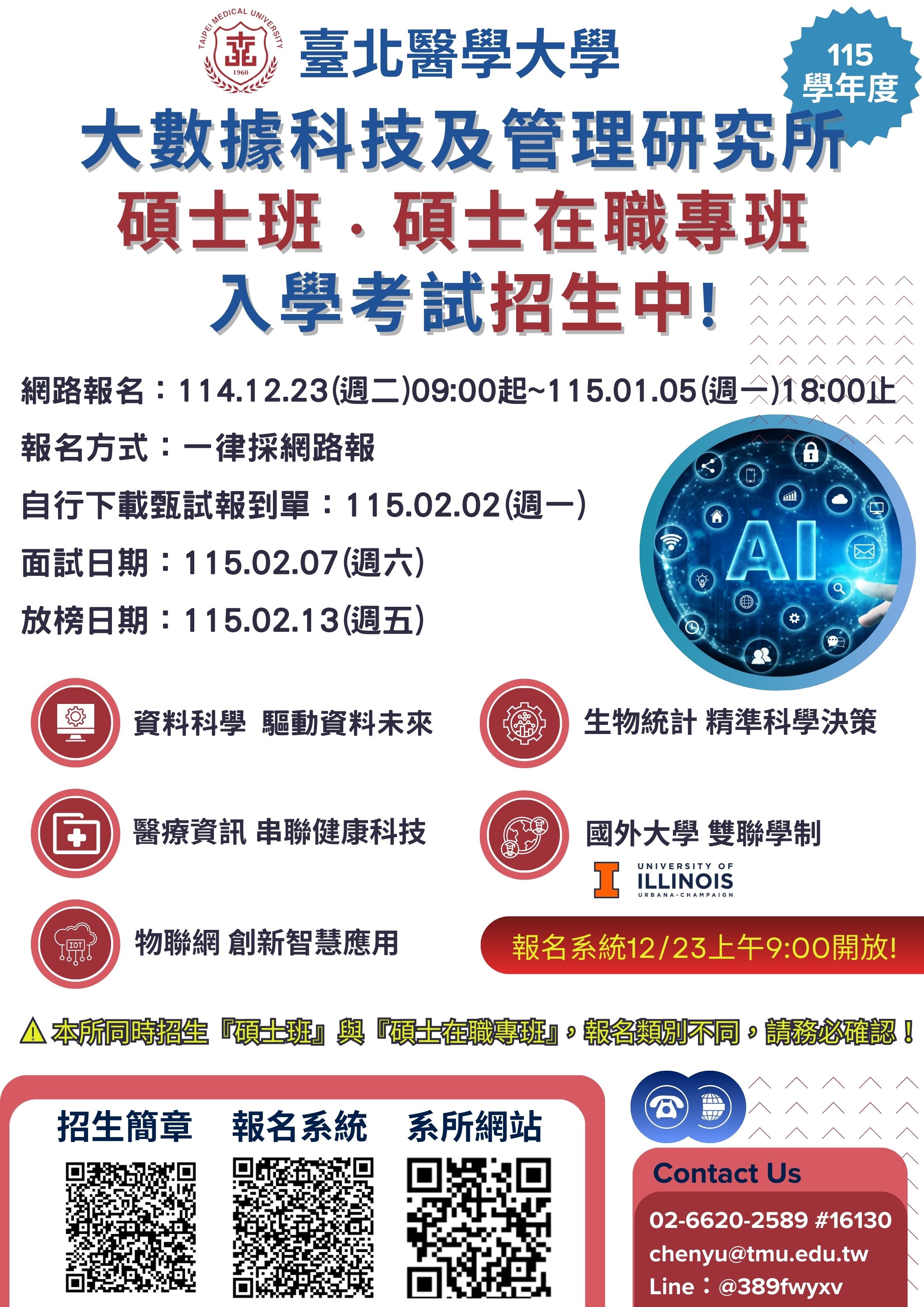 說明: 一、大數據科技及管理研究所課程涵蓋智慧醫療、生物統計、智慧物聯網與AI應用等多項領域,以巨量資料與人工智慧為核心,推動創新應用與新興產業發展,致力於培育能引領數位轉型與智慧健康發展的核心人才。 二、115學年度入學考試招生報名自114年12月23日(週二)9:00至115年01月05日(週一)18:00止,招生海報如(附件一),招生簡章如(附件二),其他重要日程、系所資訊請參閱本所網站(網址:https://reurl.cc/MMW1Kn)。 三、如有任何問題,請洽本所黃小姐 chenyu@tmu.edu.tw或加入Line官方帳號詢問:@389fwyxv。