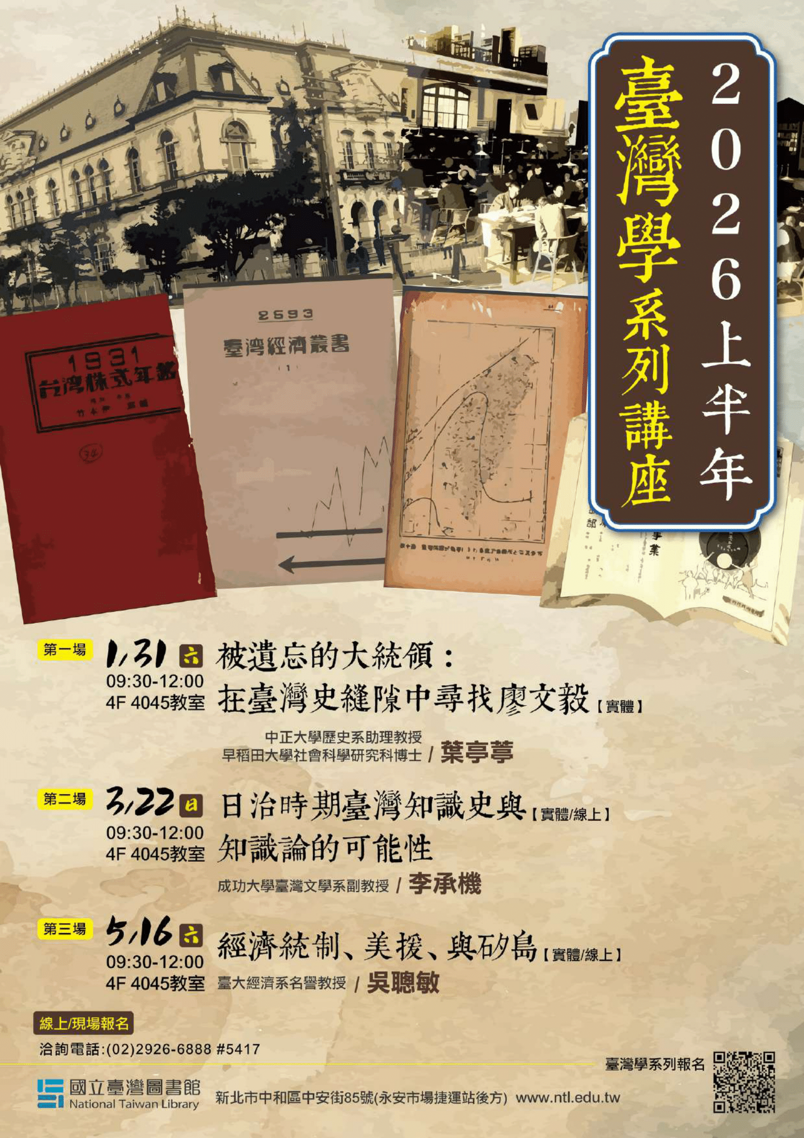 請至本館臺灣學研究中心(https://wwwacc.ntl.edu.tw/mp.asp?mp=5)「講座研習」中「講座」項下報名,或連結附件之電子DM(如附件)中QRcode報名,相關活動資訊請電洽(02)2926-6888分機5417陳先生。