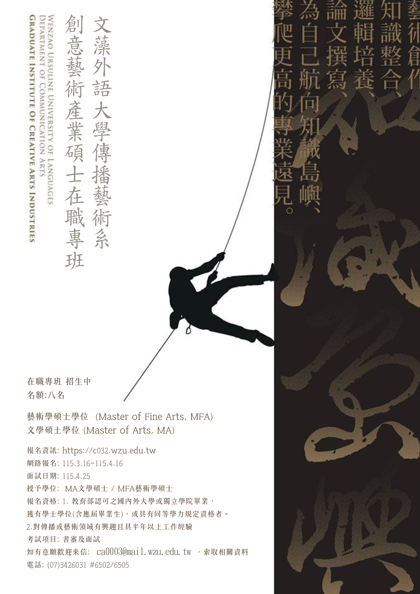 說明: 一、本校傳播藝術系創意藝術產業碩士在職專班現正招生中,誠摯邀請國中小教師踴躍報名。 二、本碩士專班提供創意藝術與產業實務結合的專業課程,提升學員藝術創作、文化產業經營及媒體傳播能力。 三、入學後,研究生亦可報考本校國小師資培育學程,修畢相關學分並完成實習規定者,可參加教育部國小教師檢定考試,通過後即可取得小學教師證書及小學教師資格。 四、報名時間自115/3/16(一)上午9時~115/4/15(三)中午12時止。 五、相關招生海報、招生簡章、招生重要日程表詳見附件。 六、如有任何疑問,請聯繫本校傳播藝術系(07-3426031分機6501、6502、6505),歡迎踴躍報名。
