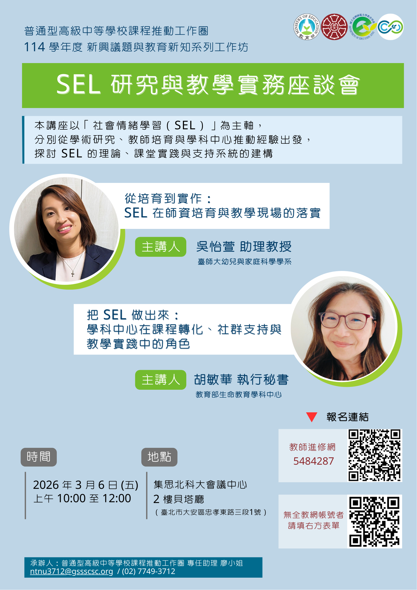 說明: 一、旨揭活動係教育部國民及學前教育署委託本校教育學系教育專業發展中心辦理,邀請來自國立臺灣師範大學幼兒與家庭科學學系吳怡萱助理教授、教育部生命教育學科中心胡敏華執行秘書,以「社會情緒學習(SEL)」為主軸,分別從學術研究、教師培育與學科中心推動經驗出發,探討SEL的課堂實踐與支持系統的建構。 二、參加對象:普通型高級中等學校學科中心之研究及種子教師、全國高級中等學校教師、全國大專院校師培生。 三、活動資訊與報名方式如下: (一)主題:SEL 研究與教學實務座談會。 (二)日期:115年3月6日(星期五)10:00至12:00。 (三)地點:集思北科大會議中心 2 樓貝塔廳。 (四)主講者:吳怡萱助理教授(國立臺灣師範大學幼兒與家庭科學學系)、胡敏華執行秘書(教育部生命教育學科中心)。 (五)報名方式:即日起至115年3月2日(星期一)至全國教師在職進修資訊網報名(研習代碼:5484287,網址:https://pse.is/8p96ca)。無全教網帳號者,請填寫表單( 網址:https://pse.is/8p96mq)。 四、注意事項: (一)活動以實體為主,線上同步直播,直播網址於報名後另以電子郵件提供。 (二)報名實體出席且完成簽到退者,始核給研習時數2小時。未報名或未簽到退者,恕不補發。